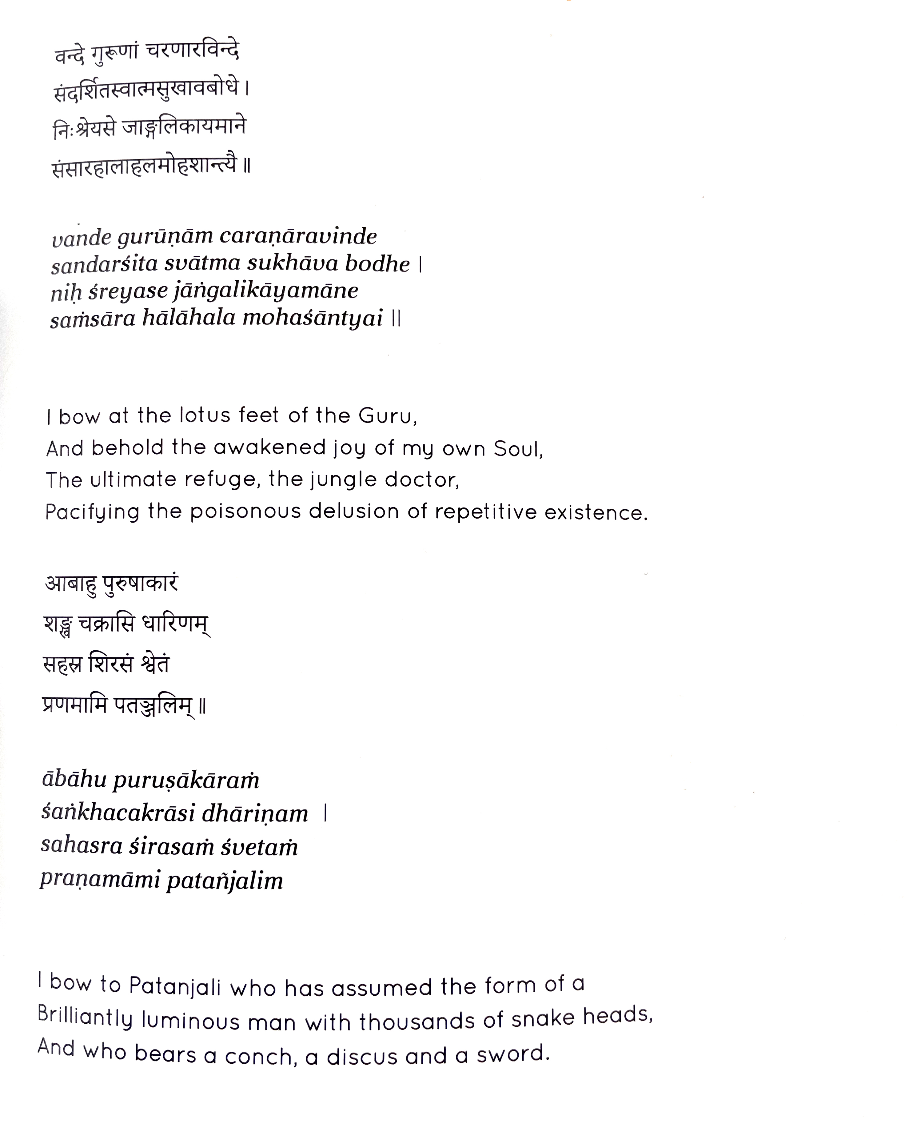 The opening chant consists of the following Sanskrit chants, the first from the Yoga Tārāvalī and the second, respects paid to Patañjali, the author of the Yoga Sutras.1